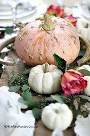 Carol at The Red Painted Cottage shared a Chic Rustic Thanksgiving Table that is absolutely gorgeous. I'm especially smitten with her all natural centerpiece featuring seeded eucalyptus, an assortment of pumpkins, antlers and roses. Pay Carol a visit to see her sources for creating an elegant holiday table. You're sure to be inspired, I know I was!